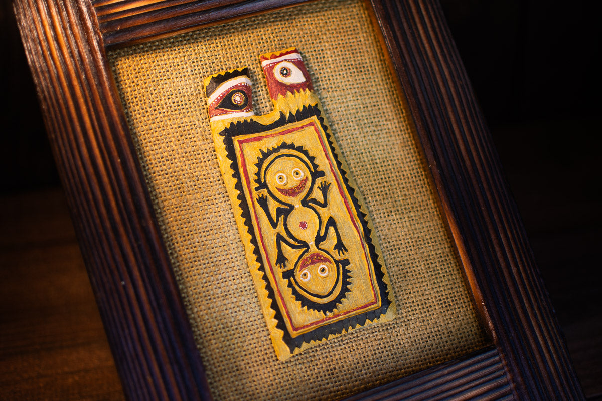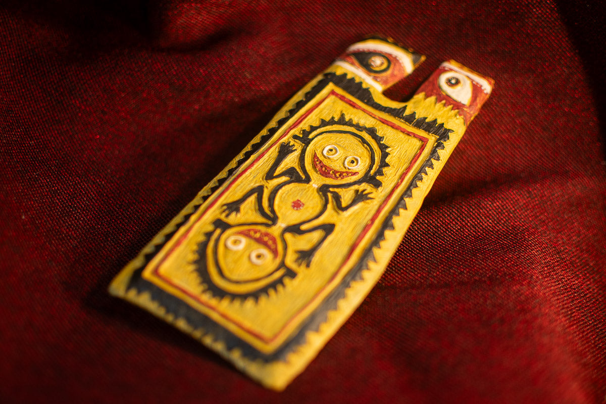 This piece is inspired by a Papua New Guinea Bowman’s Shield. It allowed an archer to keep his arms free for his bow while carrying a shield.